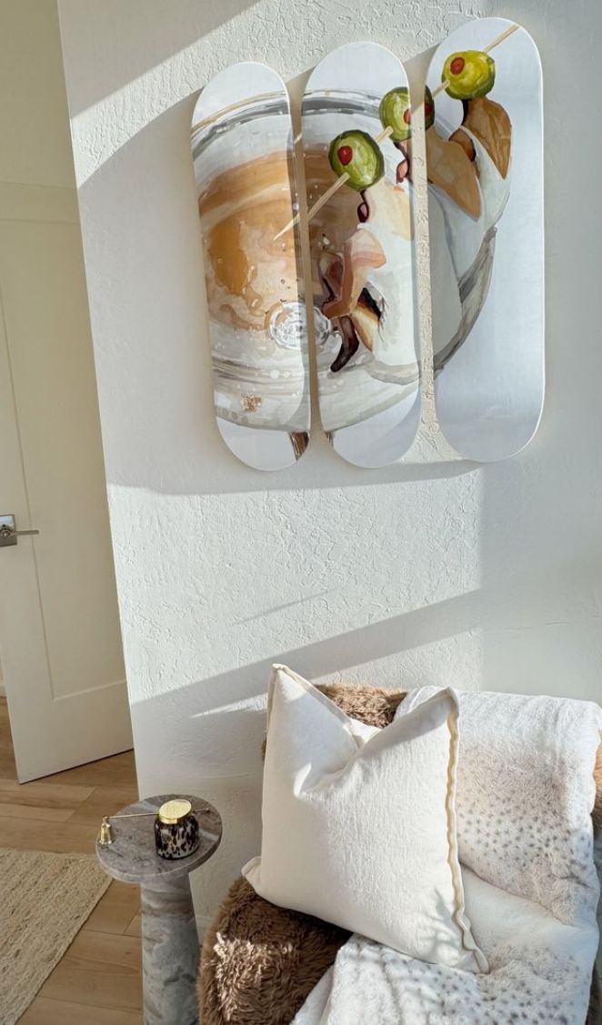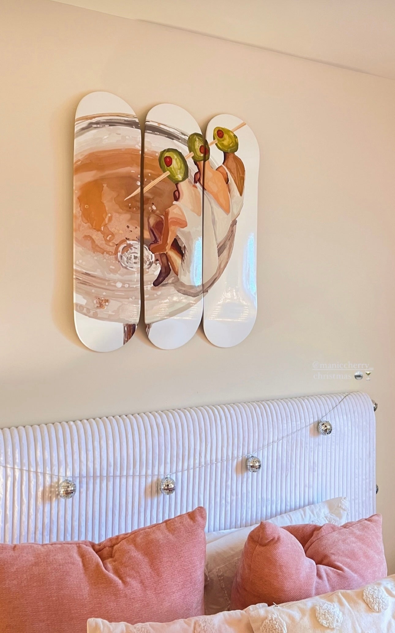 Three girls with olive heads lounging on the rim of a martini glass — totally surreal and fun. It feels like a drunk little daydream in art form. Cute, weird, and very girls-night-coded.