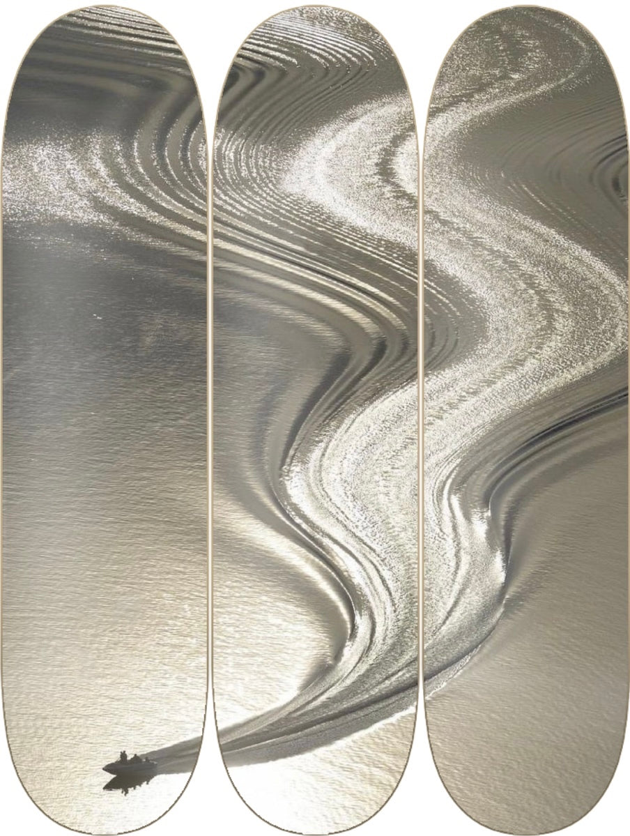 A dreamy aerial shot of a lone boat carving smooth, liquid silver trails across glassy water — peaceful, modern, and effortlessly cool.
